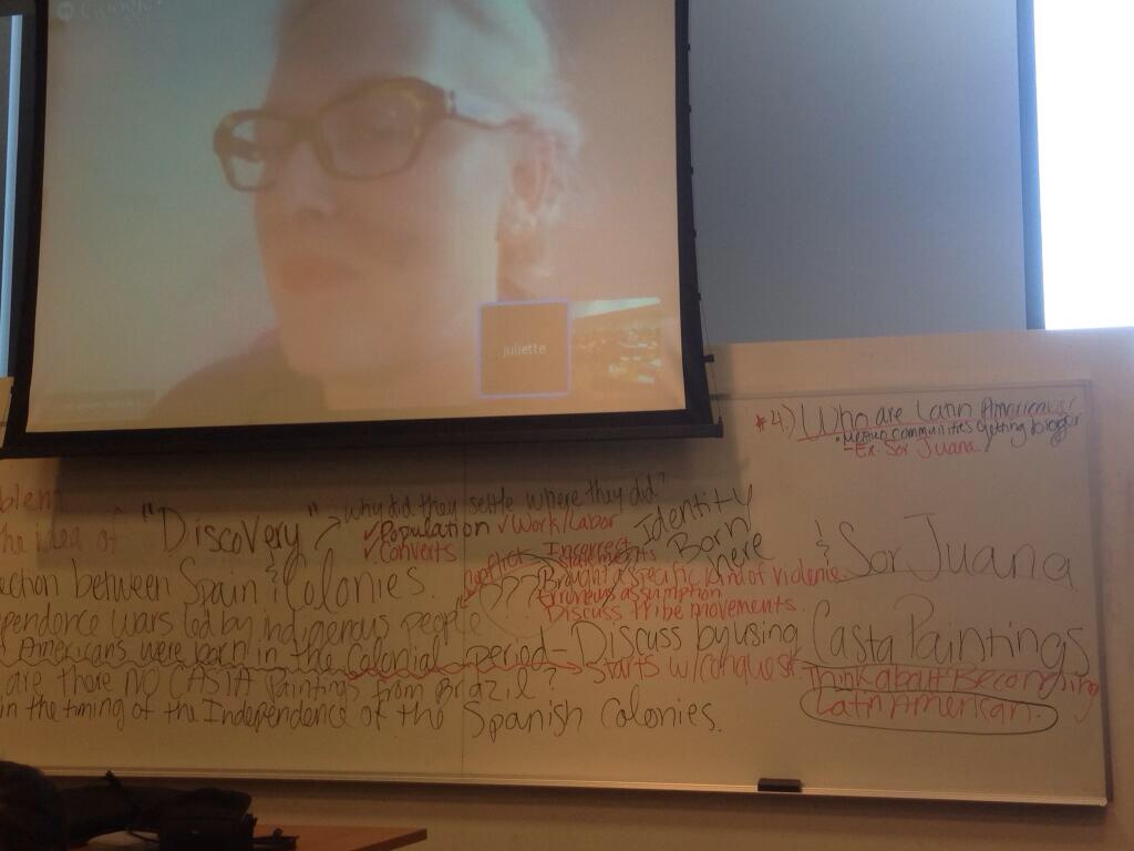 Back in Portland, I was at my desk at 2pm, and at UCR, my fantastic TA Judi and amazing graduate assistant Steve proceeded to set up the classroom. A camera was set up and pointed the students – and that camera was hooked up to a Google Hangout. Once we were connected, I could see the entire class, and hear them perfectly. They could see me on one screen, and the powerpoint presentation with the exam questions on the other screen. And below the screens, Judy wrote all the important point made in my conversations.